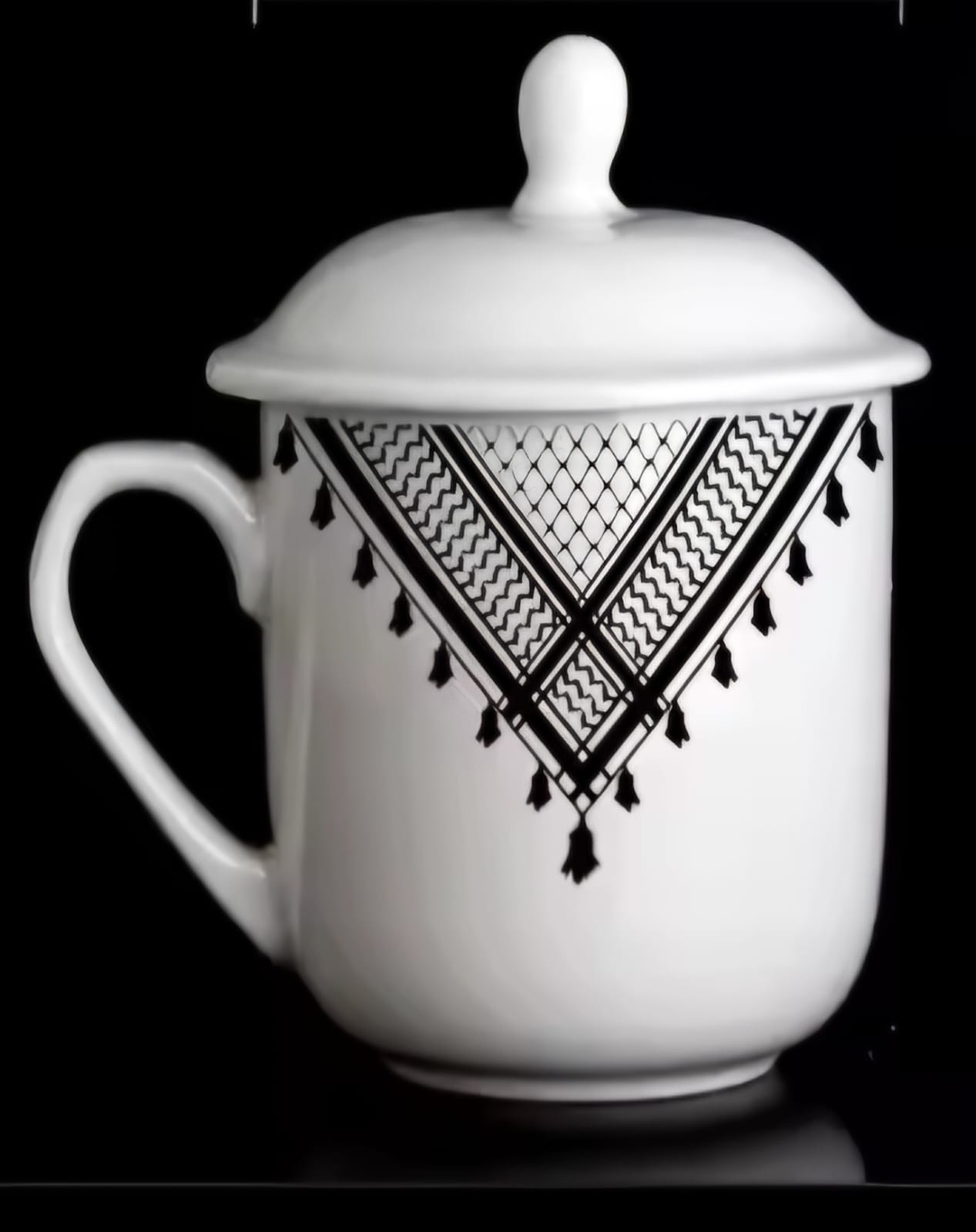 Porcelain Keffiyeh Mug with Lid brings tradition and elegance to your daily routine. Crafted from high-quality porcelain, this mug combines a timeless design inspired by the iconic Palestinian keffiyeh pattern with practical features that enhance your drinking experience.